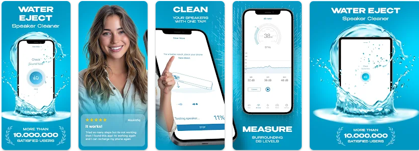 음파 및 진동 기술을 사용하는 워터 이젝터 스피커 앱은 워터 이젝터 앱, 사운드 데시벨 측정기, 먼지 청소기, 소음 측정기 및 스피커 청소와 같은 일반적인 문제를 해결합니다.
