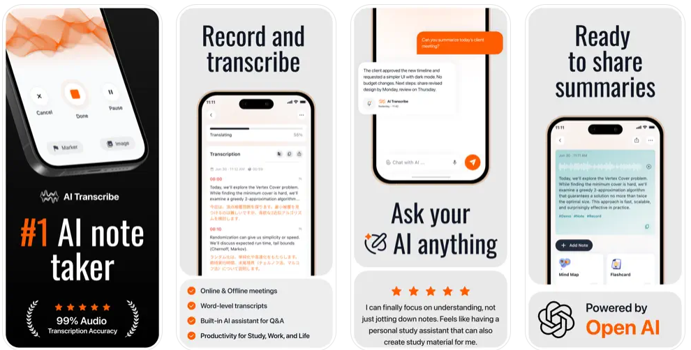 AI Transcribe: Note Taker – Record, Transcribe, Summarize & Learn Smarter Never miss an important detail again. AI Transcribe: Note Taker is your all-in-one AI-powered productivity assistant for transcribing audio, summarizing meetings, creating study