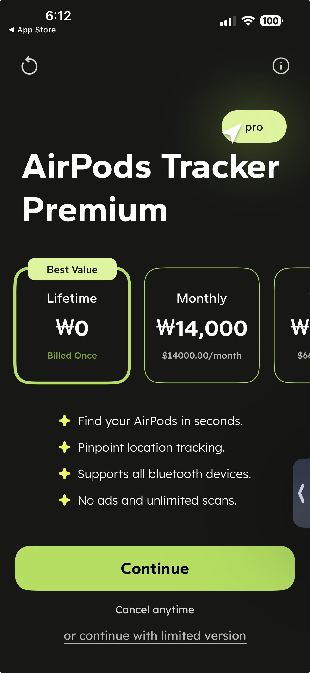 Air Finder는 주당 4.99달러 또는 월 9.99달러의 두 가지 구독 옵션을 제공합니다. 현재 구독 기간 종료 24시간 전에 취소하지 않으면 구독은 자동으로 갱신됩니다. 계정 설정에서 구독을 관리할 수 있습니다. 현재 구독 기간 종료 24시간 이내에 갱신 요금이 계정에 청구됩니다. 구독을 구매하면 사용하지 않은 무료 체험 기간은 소멸됩니다.