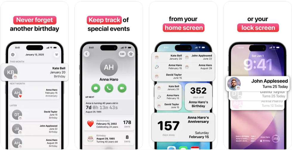 Effortlessly keep track of birthdays and special events with Dateminder! Dateminder syncs key dates from your contacts directly to your app, calendar, and widgets, ensuring you never miss a moment. From birthdays and anniversaries to other important dat