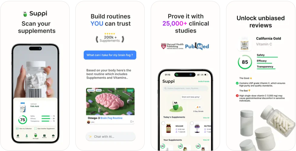 Suppi is your AI-powered supplement coach. Scan any vitamin, herb, or supplement in seconds. Check safety, efficacy, and transparency scores powered by 500+ clinical studies (PubMed, Harvard Health, Mayo Clinic). Chat with Suppi to create personalized s