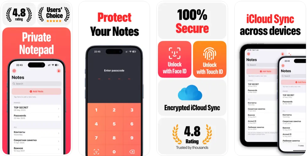 Keep your secrets safe. Secret Notes is the most secure and elegant way to store private thoughts, passwords, ideas, and personal reminders — all protected with Face ID, Touch ID, or a passcode. Why Secret Notes? • Secure your privacy Your notes are