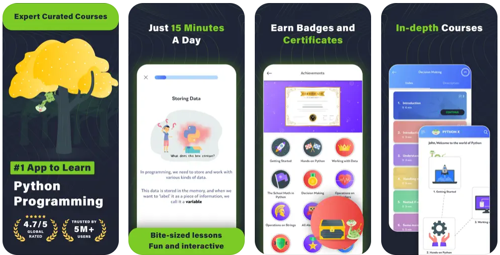 "Python X"는 스마트폰에서 Python을 배우는 데 도움이 되는 최고이자 가장 사랑받는 앱 중 하나입니다. 이 앱의 특징은 다음과 같습니다.