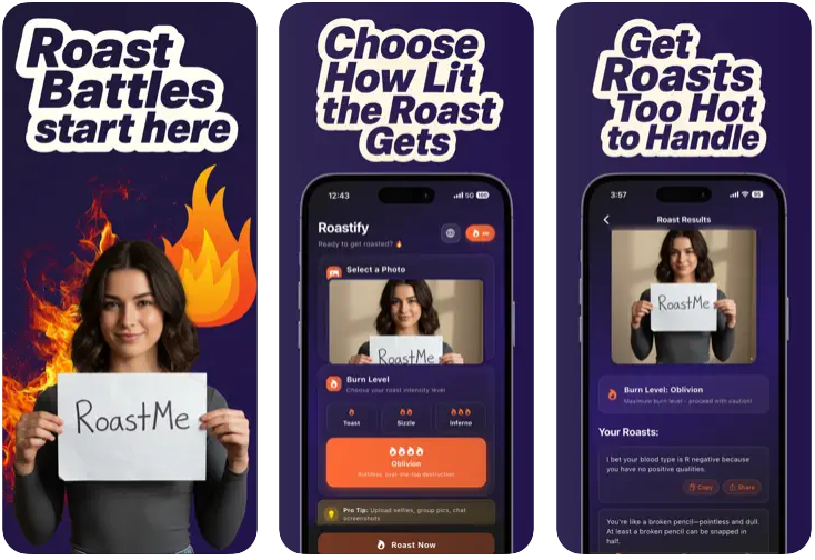 Unleash epic laughs with Roastify – the ultimate roast generator for fiery, personalised burns! Snap a photo or upload a chat screenshot to get 5 instant roasts, crafted to spark hilarity. Perfect for roasting friends at parties, firing up group chats