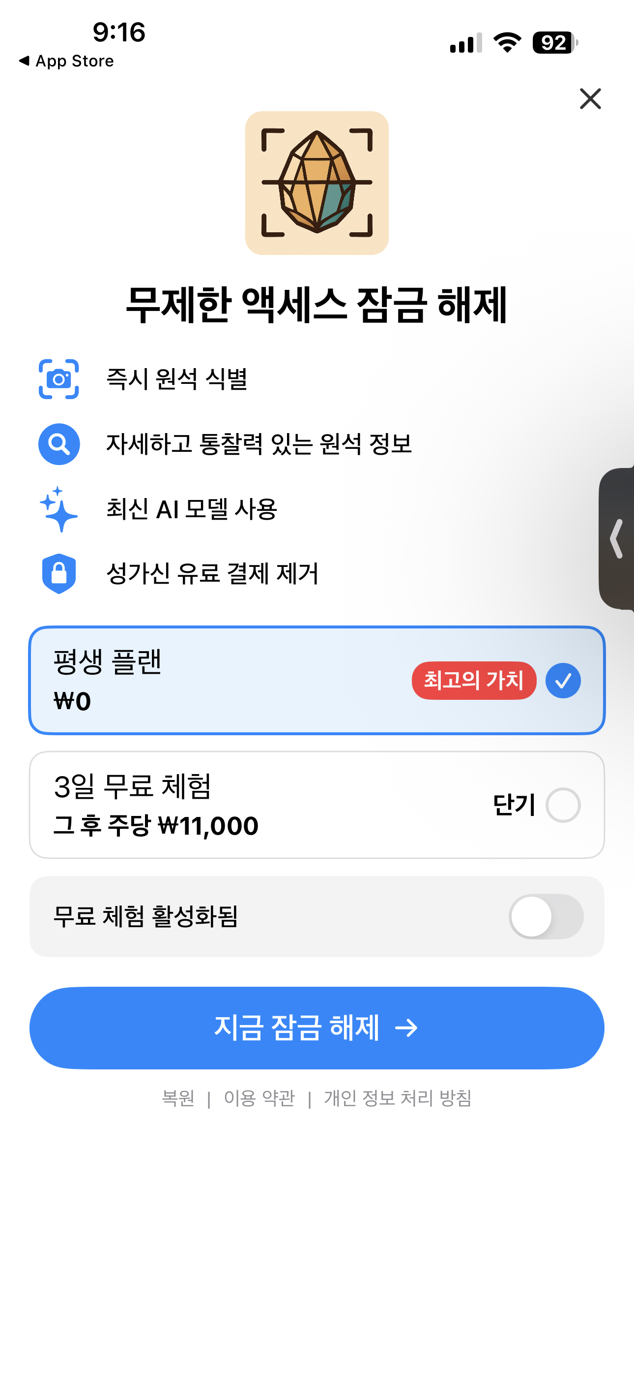 - 즉시 AI 분석과 식별: 암석, 보석, 광물, 크리스탈 스캔