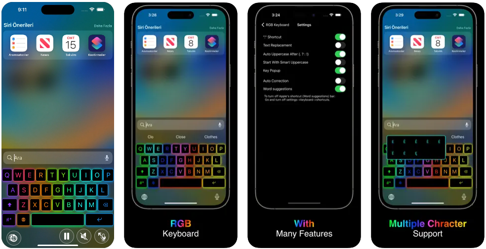 Get the RGB keyboard experience on your device! Features - Customizable animated keyboard lighting - Use 2 language at same time(double tap "#*" button to switch language) - Autocorrection and Suggestions - Access many characters like ğ, ı, ç, ö, ü