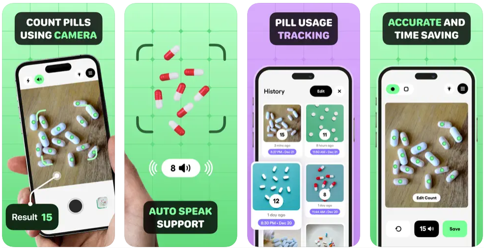 이 앱의 다양한 기능은 모든 모양과 크기의 알약과 캡슐을 세는 데까지 확장되어 다양한 약물을 관리하는 데 정확성과 용이성을 보장합니다.