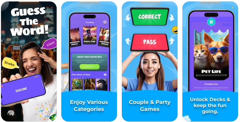 직업, 동물, 신화, 인터넷 속어 등 재미있는 무료 덱을 지금 바로 이용하세요. 빠른 광고 보상을 시청하면 유령의 집이나 시간 여행자 같은 추가 팩을 잠금 해제할 수 있습니다.