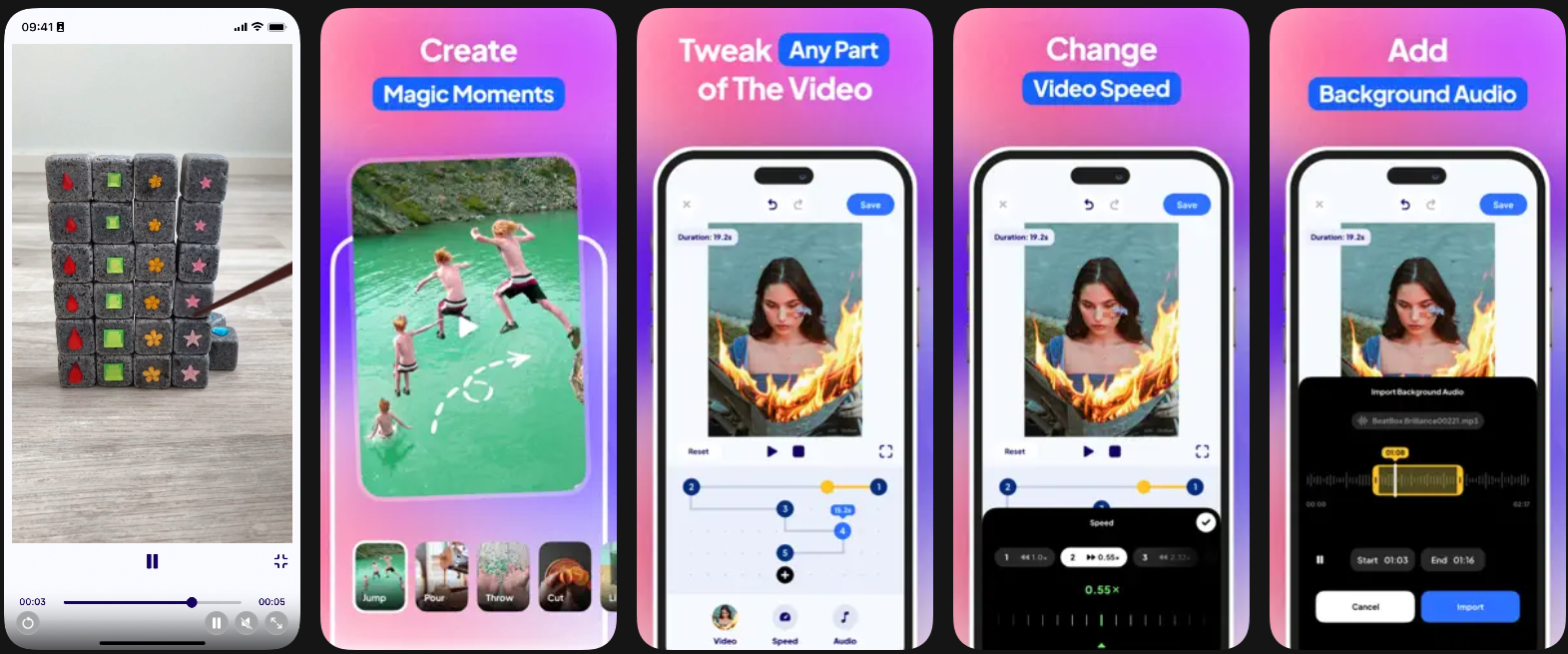 특정 구간을 역재생하여 특별한 효과를 연출하고, 창의적인 비전에 맞춰 속도를 조절하고, 좋아하는 음악이나 음향 효과를 추가하여 더욱 풍성한 경험을 선사하세요. 사용자 친화적인 인터페이스를 통해 손쉽게 편집을 시작할 수 있습니다.